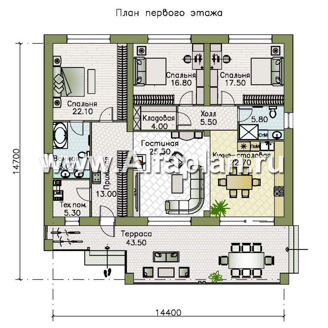 «Аметист» - проект одноэтажного дома, с террасой со стороны входа, 3 спальни, в стиле барн - технические характеристики