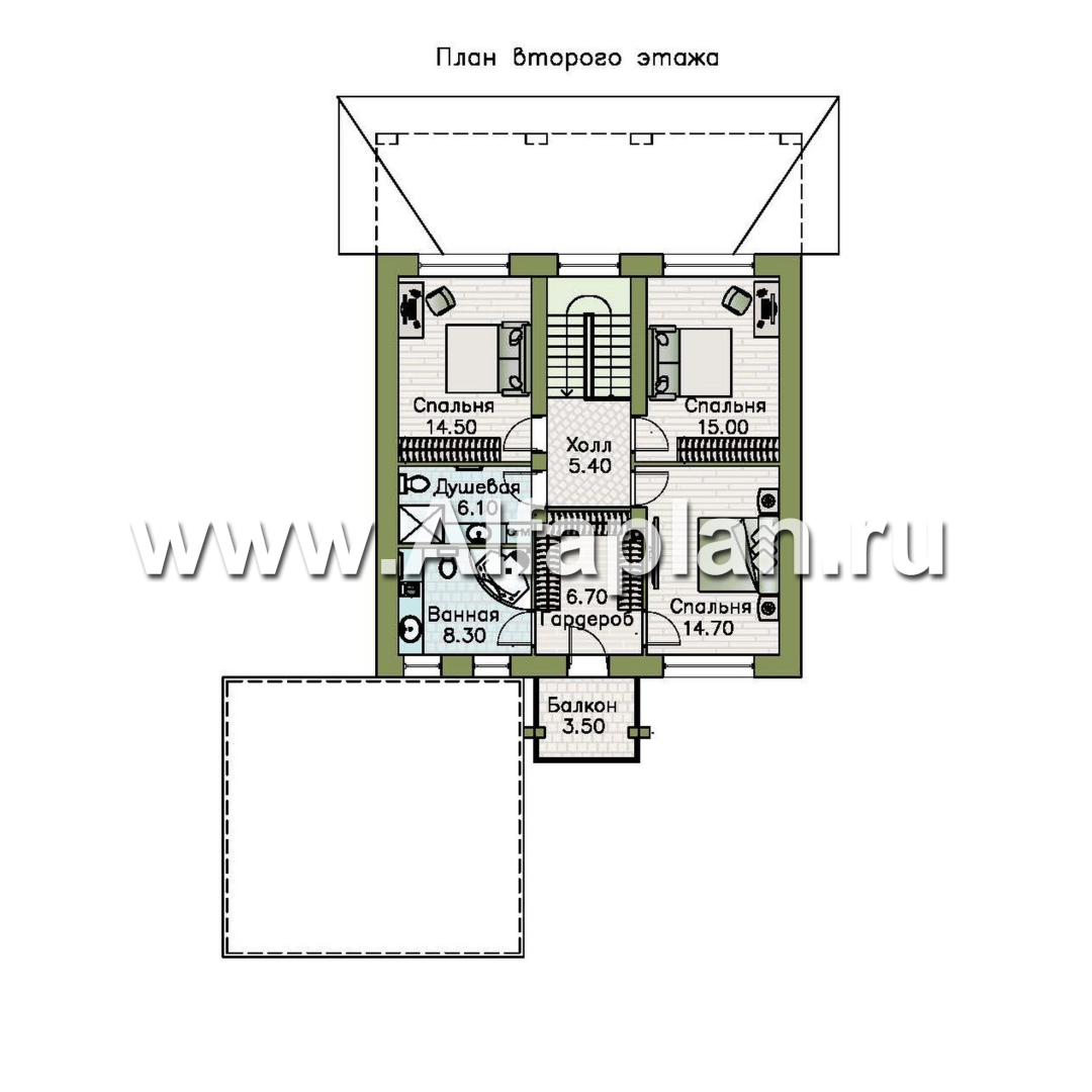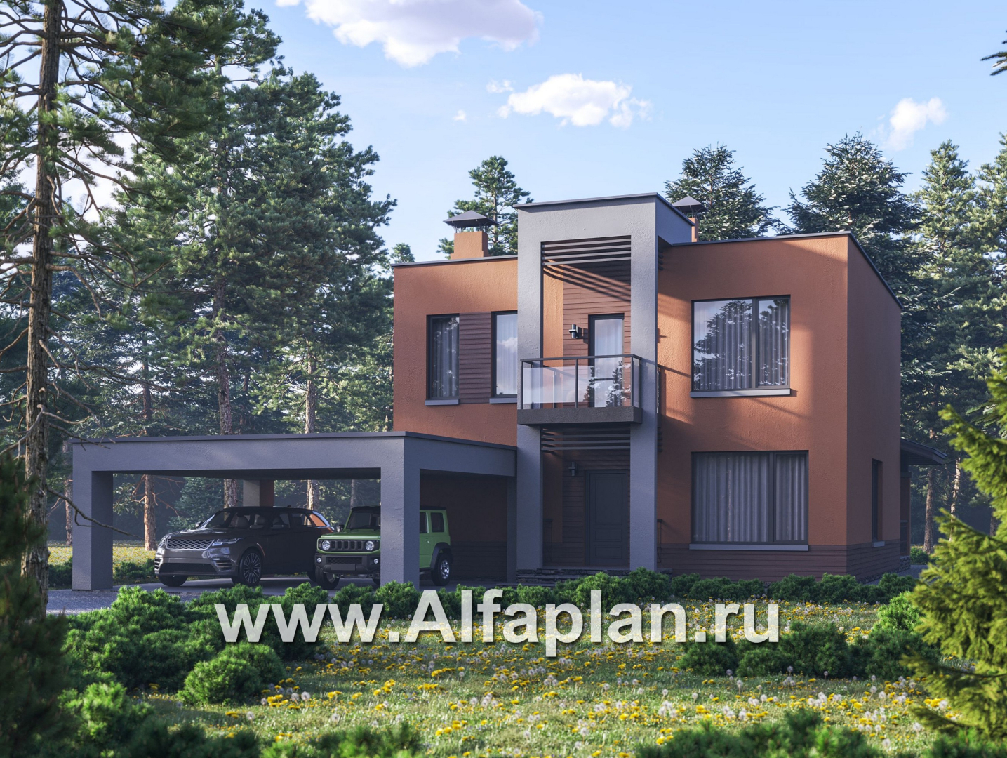 757E-S «Невада» - проект двухэтажного дома из газобетона, с террасой, навес на 2 авто, с плоской крышей в стиле минимализм