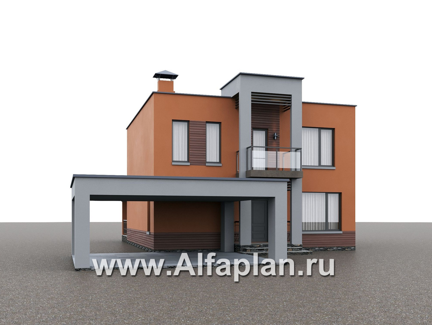 «Невада» - проект двухэтажного дома из газобетона, с террасой, навес на 2 авто, с плоской крышей в стиле минимализм