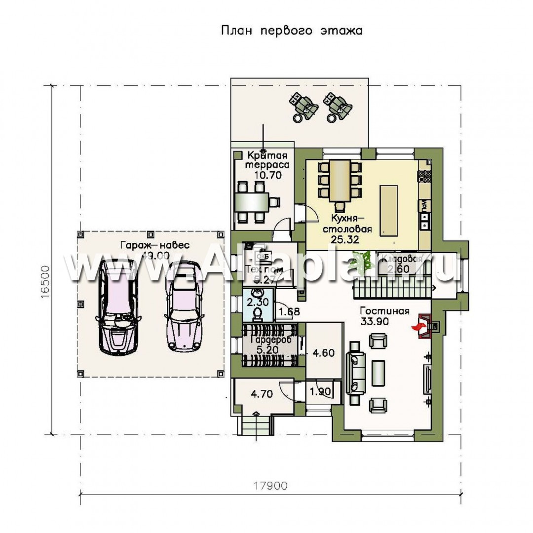 188B-S «Потемкин» - проект двухэтажного дома из газоблоков, планировка с лестницей в гостиной и мастер спальня, навес на 2 авто