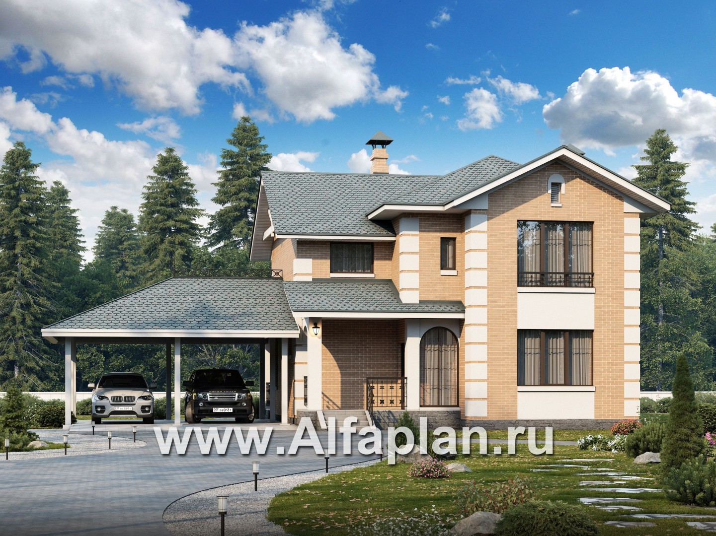 «Потемкин» - проект двухэтажного дома из газоблоков, планировка с лестницей в гостиной и мастер спальня, навес на 2 авто - технические характеристики