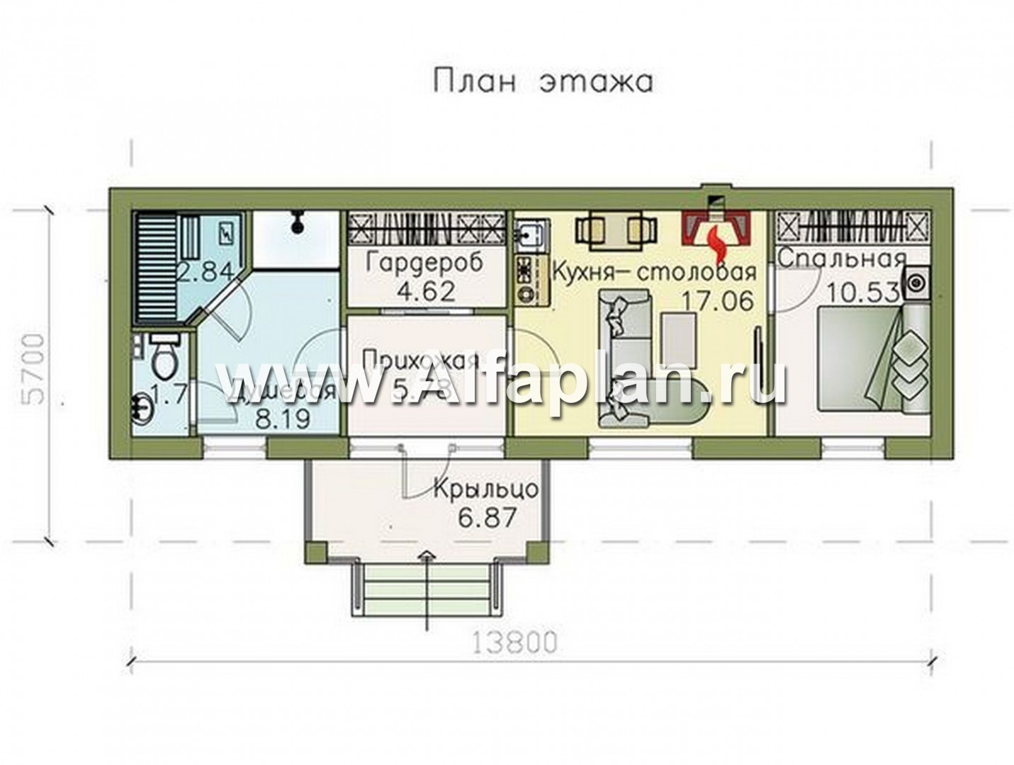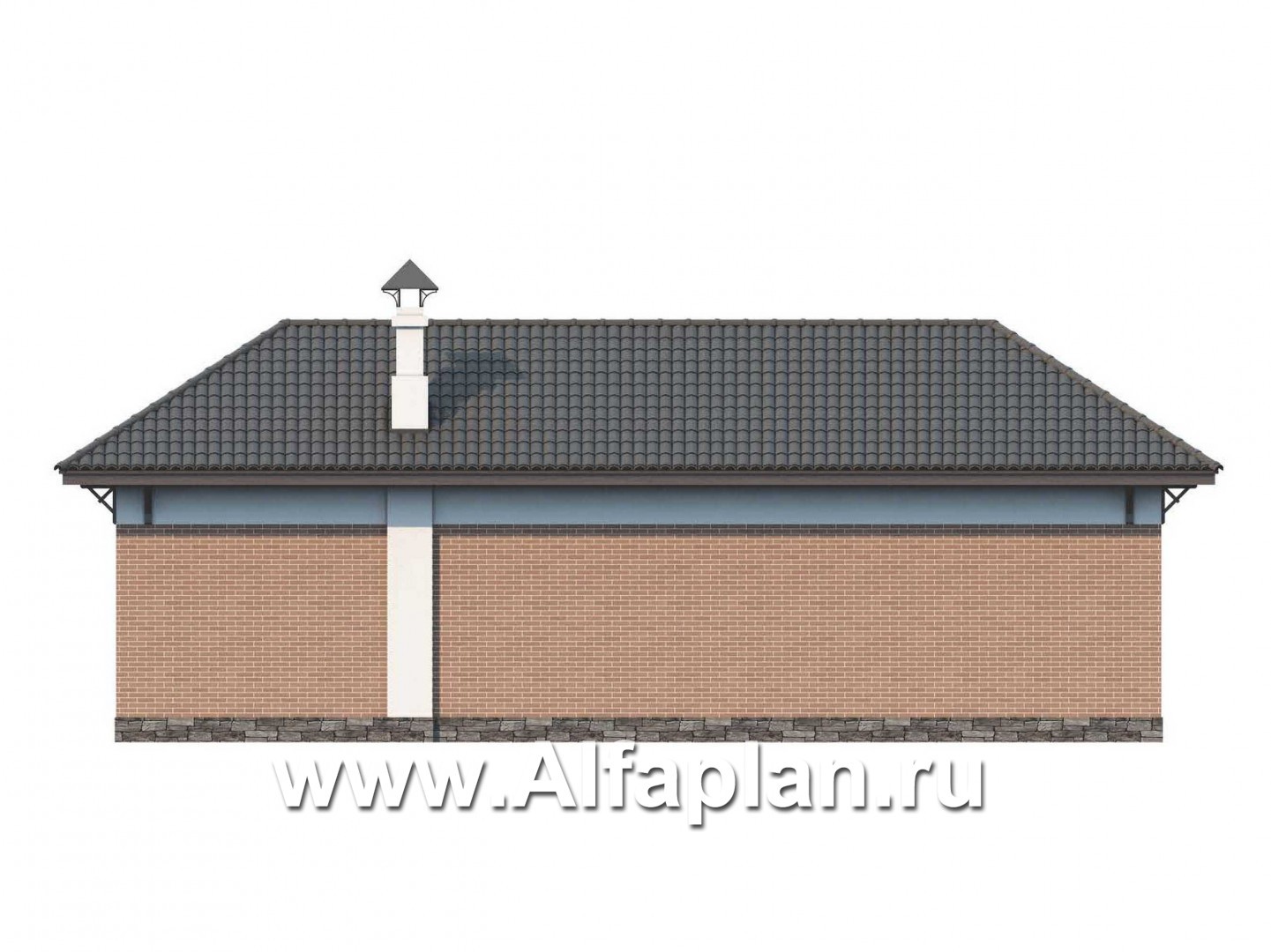 Представленный здесь проект пено-, газобетонного дома имеет всего один этаж. Смысловым центром является прихожая, расположенная на одной линии с центральным входом. Часть пространства этого помещения отдана под гардеробную.