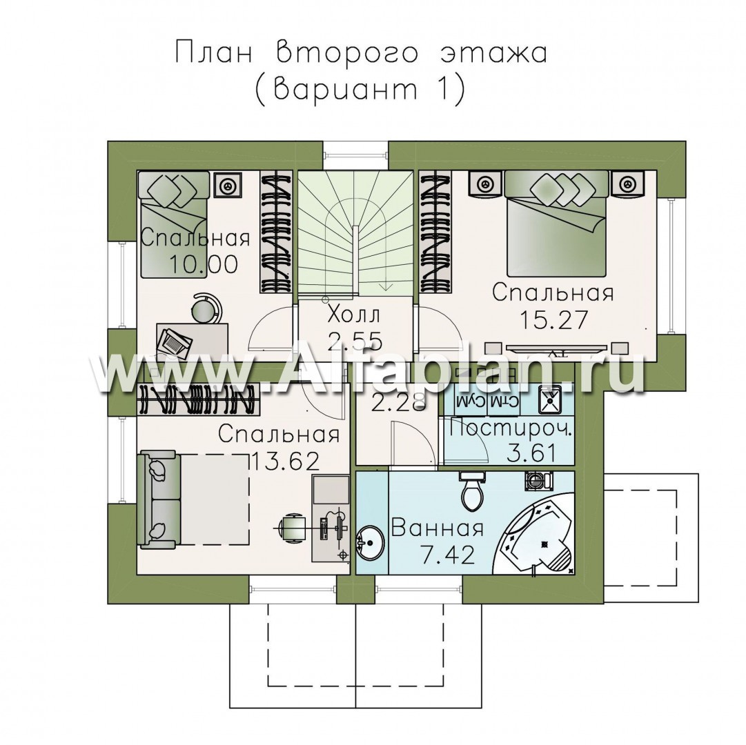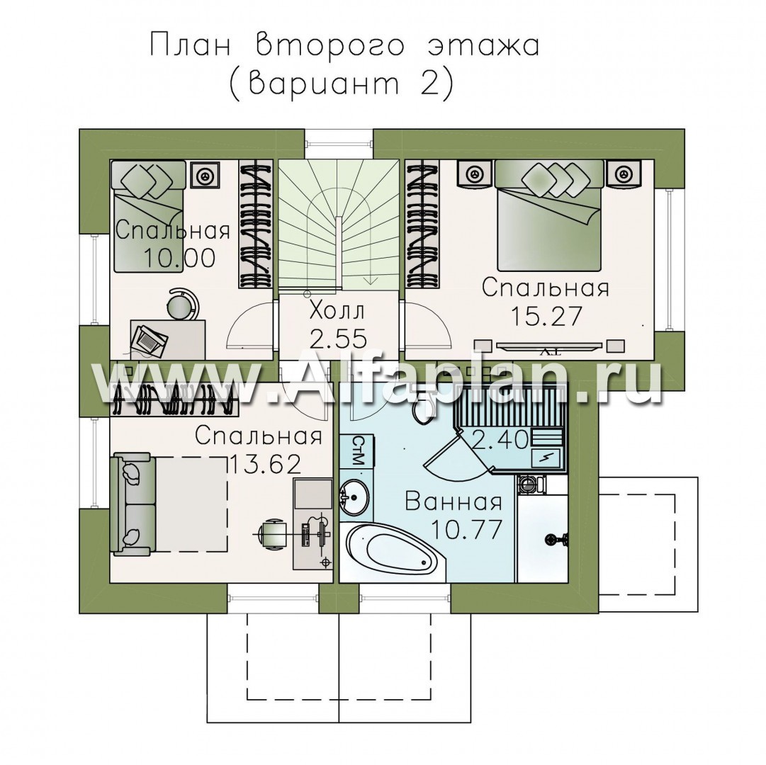 Пространство второго этажа отдано под приватную группу: она представлена тремя не равнозначными по площади спальнями. В отношении обустройства ванной комнаты есть два варианта проекта. Согласно первому, рядом с ванной комнатой предполагается разместить постирочную: входы в эти помещения располагаются в небольшом тамбуре, сообщающемся с холлом. Согласно второму проекту, в ванной комнате, занимающей площадь и постирочной и тамбура, дополнительно оборудуется сауна