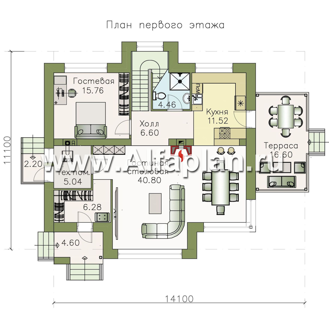 Планировка первого этажа предусматривает гостиную и столовую с окнами на сторону главного фасада. Кухня примыкает к столовой. На первом этаже есть также кабинет (гостевая) 16м2.