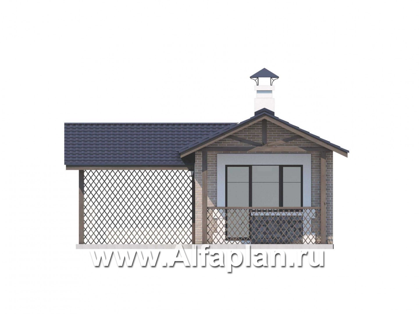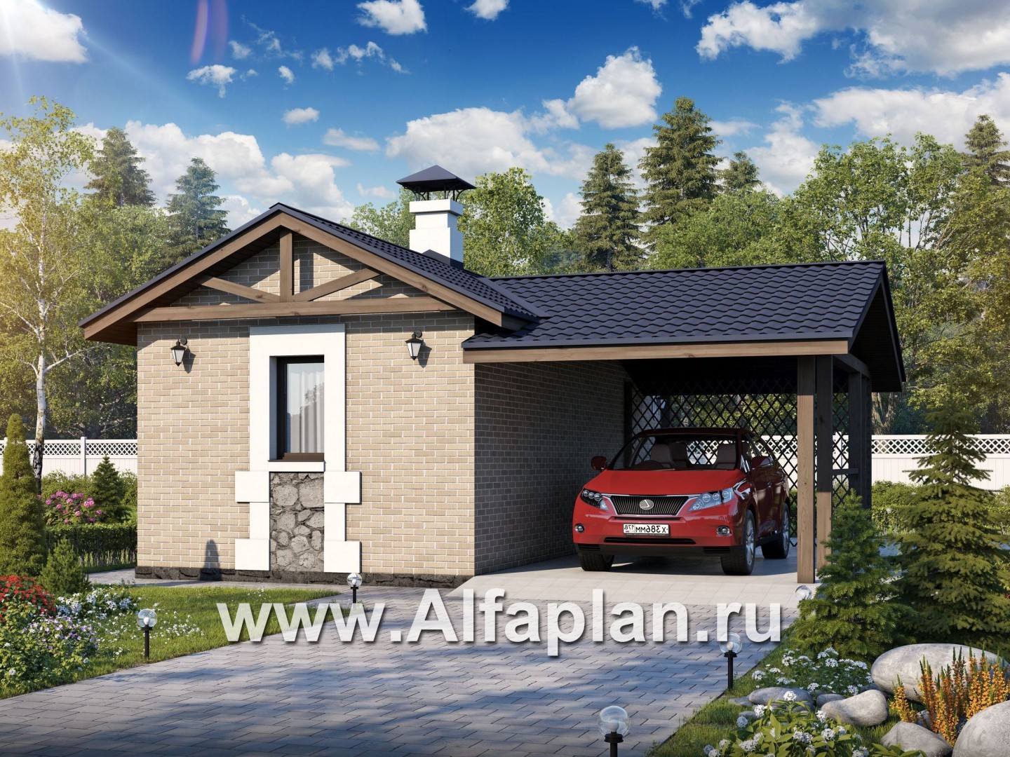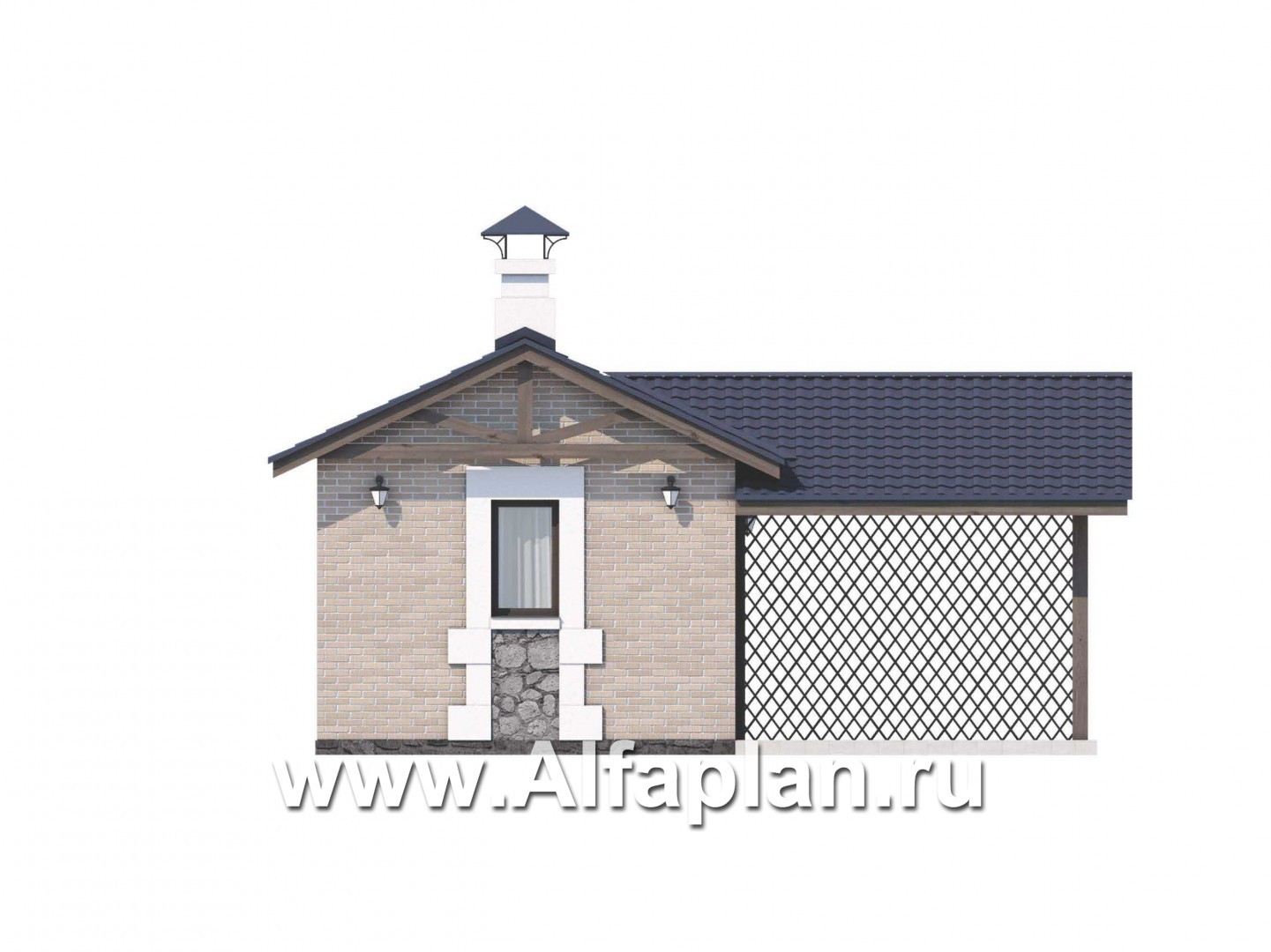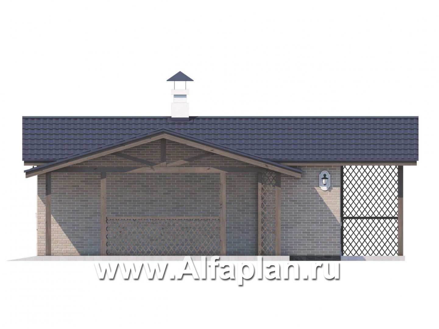 Гараж-навес оформлен декоративными решетками и совмещен с открытым дровником. На переднем фасаде расположено окно. Вход в отдельную большую кладовую и хозблок находятся сзади.