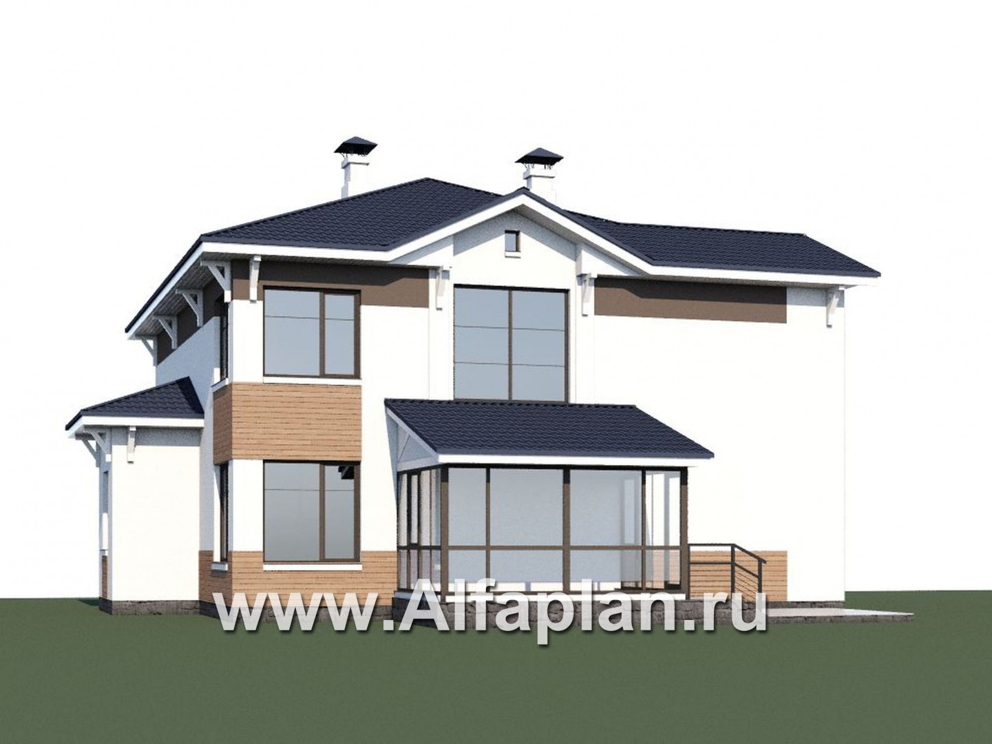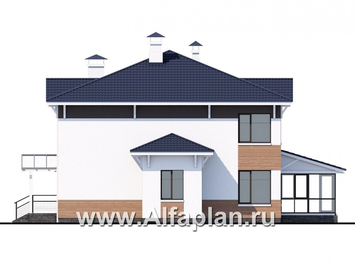 Красивый стильный коттедж оформлен очень оригинально. С белым фоном декоративной штукатурки органично сочетаются шоколадно-карамельные вставки (в том числе из дерева). Темные оконные рамы и черепица создают гармоничный контраст, а навес над центральный крыльцом, наоборот, оформлен из белых деревянных балок. Этот особняк с шикарным экстерьером выглядит роскошно и изысканно.