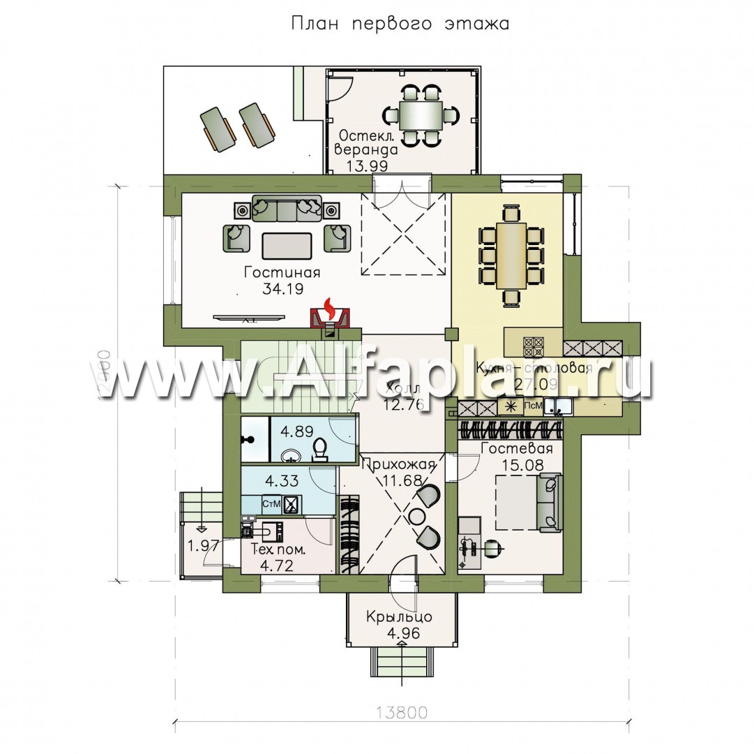 На первом этаже проект коттеджа подразумевает наличие прихожей, холла, технического помещения (имеется отдельный вход со двора), постирочной, санузла с туалетом и душевой кабиной, гостевой комнаты, кухни-столовой, гостиной с камином. С задней стороны здания имеется застекленная веранда, через которую обустроен запасной вход в коттедж.