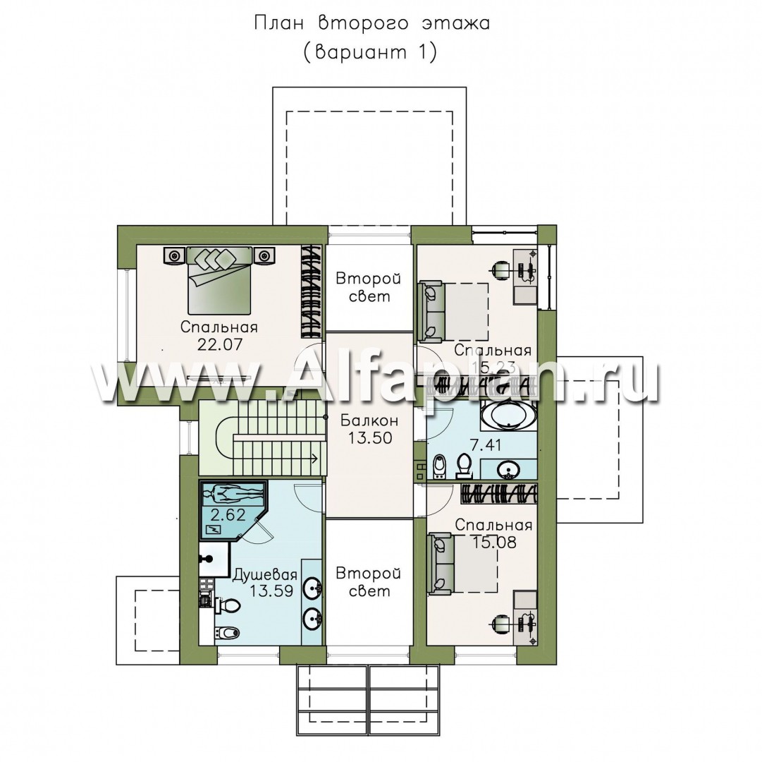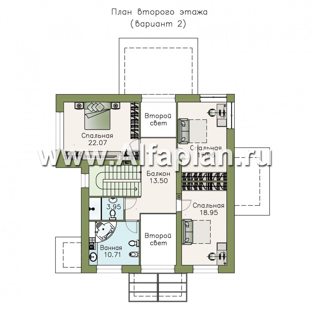 На втором этаже предполагается наличие холла, трех спален, ванной комнаты, санузла с душевой кабиной и мини-сауной. Существует также альтернативный вариант исполнения проекта на втором этаже. Ванная комната в левом крыле отсутствует, за счет чего площадь двух спален значительно увеличивается. В правом крыле здания не предусмотрена мини-сауна, а имеется два санузла: больший с ванной, меньший – с душевой кабиной.