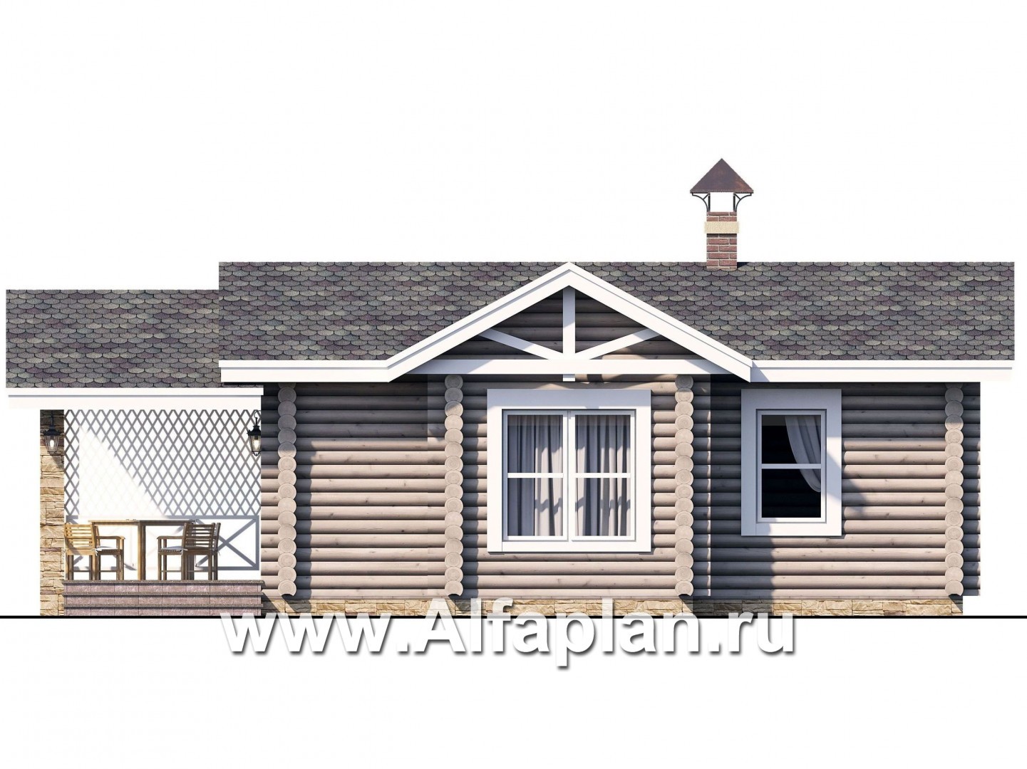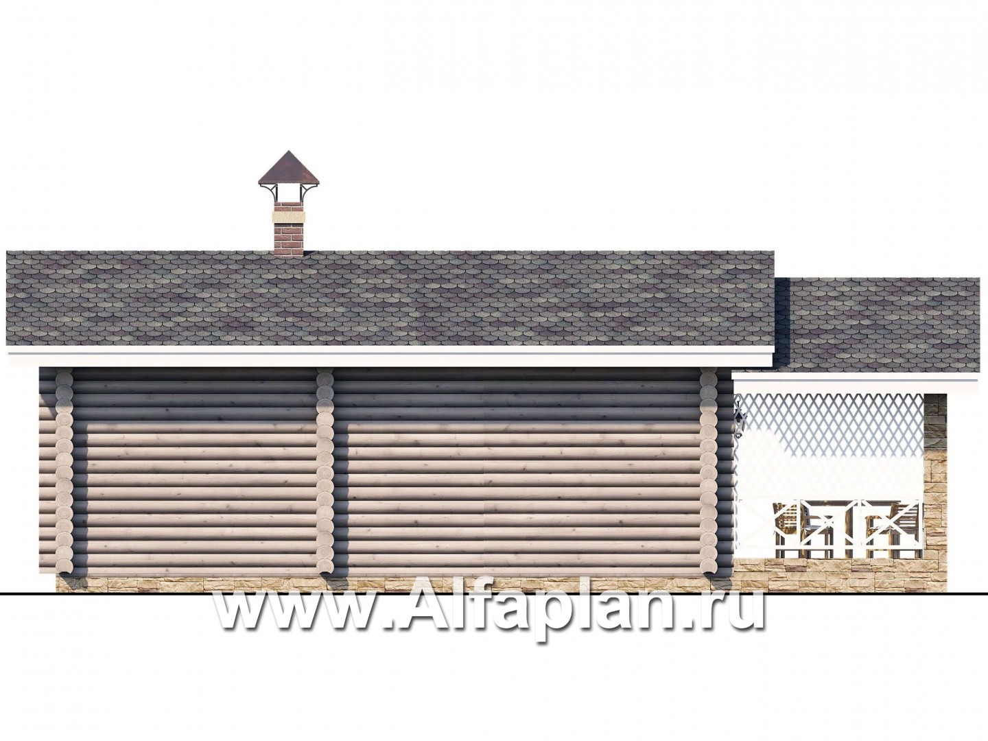 805C-S Проект бани, из дерева, из бревен, с террасой, вдоль границы участка