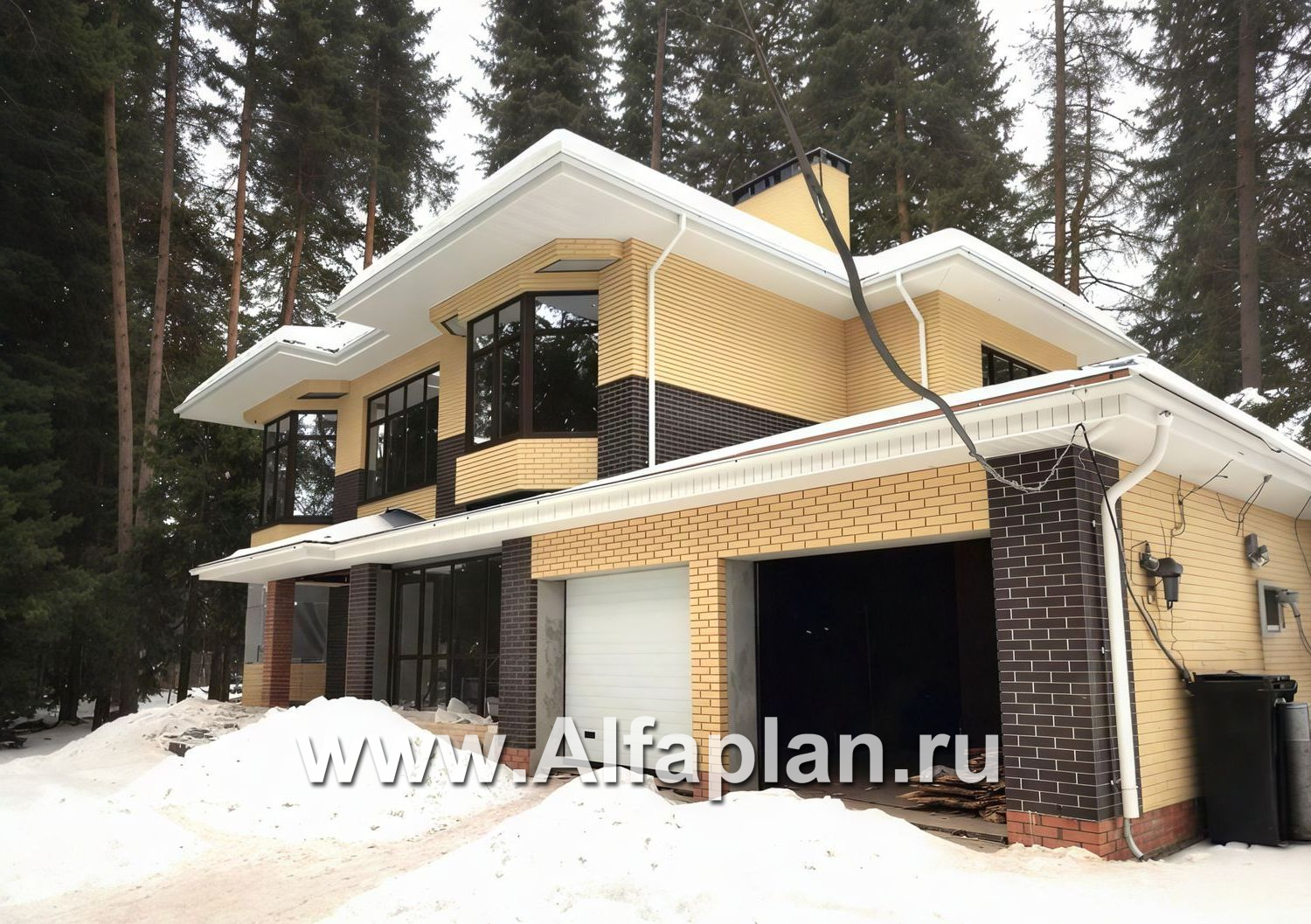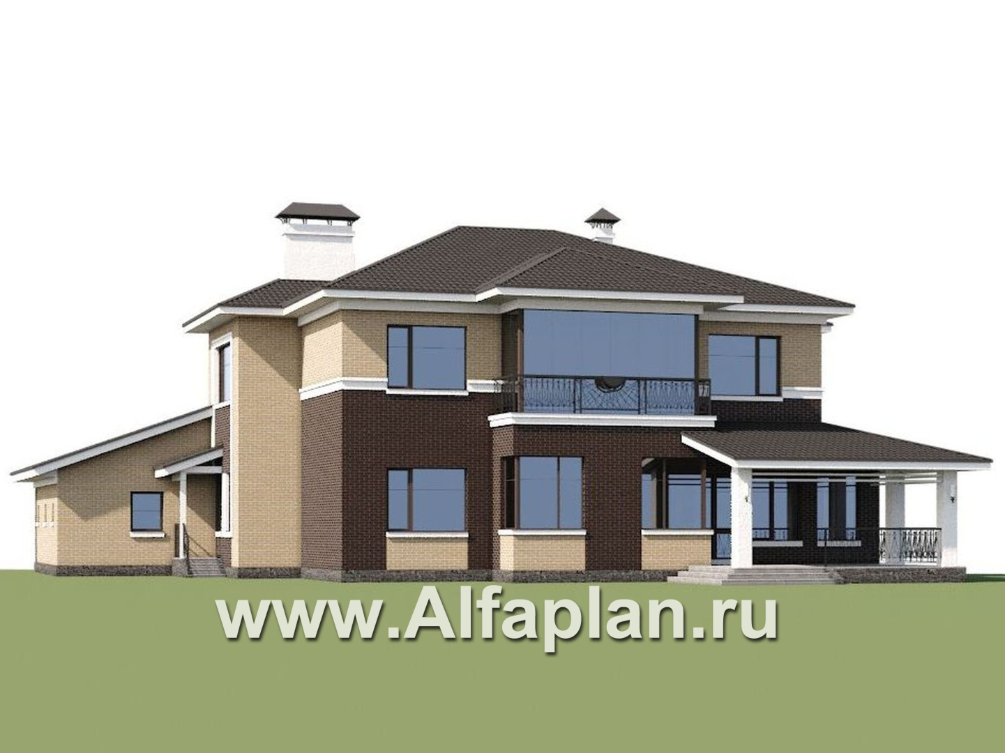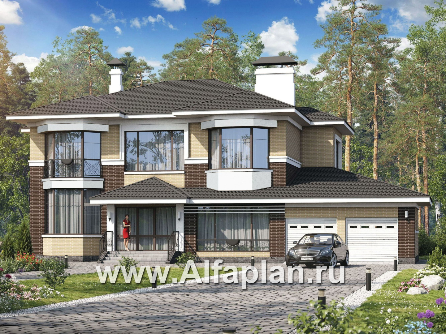 Гараж на два автомобиля, эркерные остекленные симметричные выступы, множественное ленточное остекление нижнего этажа — всё это в сочетании с облицовочным кирпичом и керамической черепицей темно-пастельных тонов формирует привлекательный солидный образ виллы, делая ненарочитый акцент на статусности её владельца.